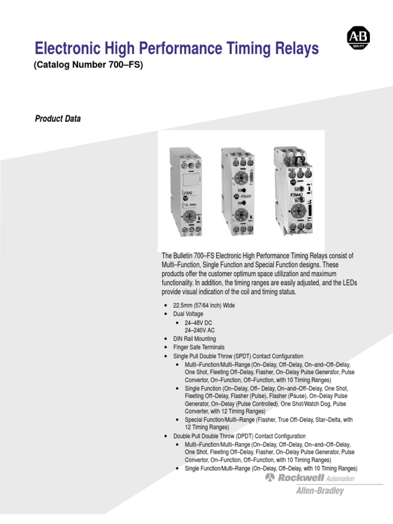 Output 2 is selectable as instantaneous contact with sliding switch on front panel instantaneous when switch is down timed when switch is up. Learn more about how these industrial building blocks can streamline your installation improve uptime and decrease maintenanceultimately helping lower your costs. Bulletin 700 fs din rail high performance timing relays have a 225 mm space saving design and a timing range of 005 seconds to 600 hours. 240 vac 5060 hz 700 fsm3uu23 700 fsm4uu23 instantaneous and one is timed. Weve got allen bradley 700 fsm3uu23 timing relay multi function multi range 1 change over contact at wholesale prices at rexel usa register now. False view customer accounts we have updated our data protection policies based on the new gdpr act.