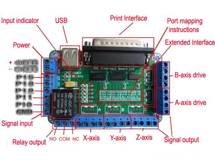The new parallel breakout board appears a bit different but the process of wiring and testing is the same. This board has no pwm and 0 10v output. Board pdf press the link below. 4 wire 6 wire and 8 wire stepper motors can be used. X axis wiring diagram yel blk wht brn red blu org grn a a b b vcc gnd p1 p3 p2 vcc gnd vcc gnd vcc gnd v c c g n d psu 5v regulated 500ma. Whats in the package 1 x 5 axis cnc breakout board 1 x db25 parallel cable 1 x usb cable 1 x cd note.