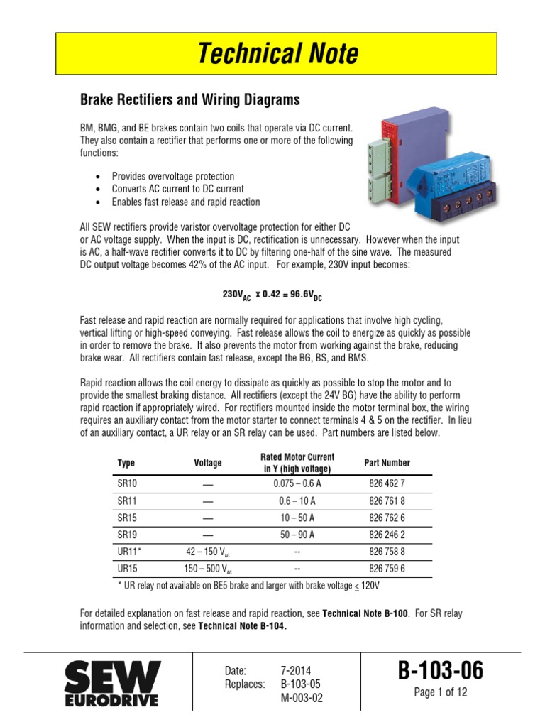 6 2018 common connection diagrams 24 brake control sew brakes are available for either normal or rapid starting. The brake endshield is a part of both the motor and the brake. 232 basic functions in contrast to other disc brakes with a dc coil the sew brakes operate with a two coil system. When connecting the supply power from the motor terminal block to the brake rectifier follow the specifications below. The bme brake rectifier is a half wave rectifier with overvoltage protection elements and electronic control for reducing the brake release reaction times. Product training 23 troubleshooting.